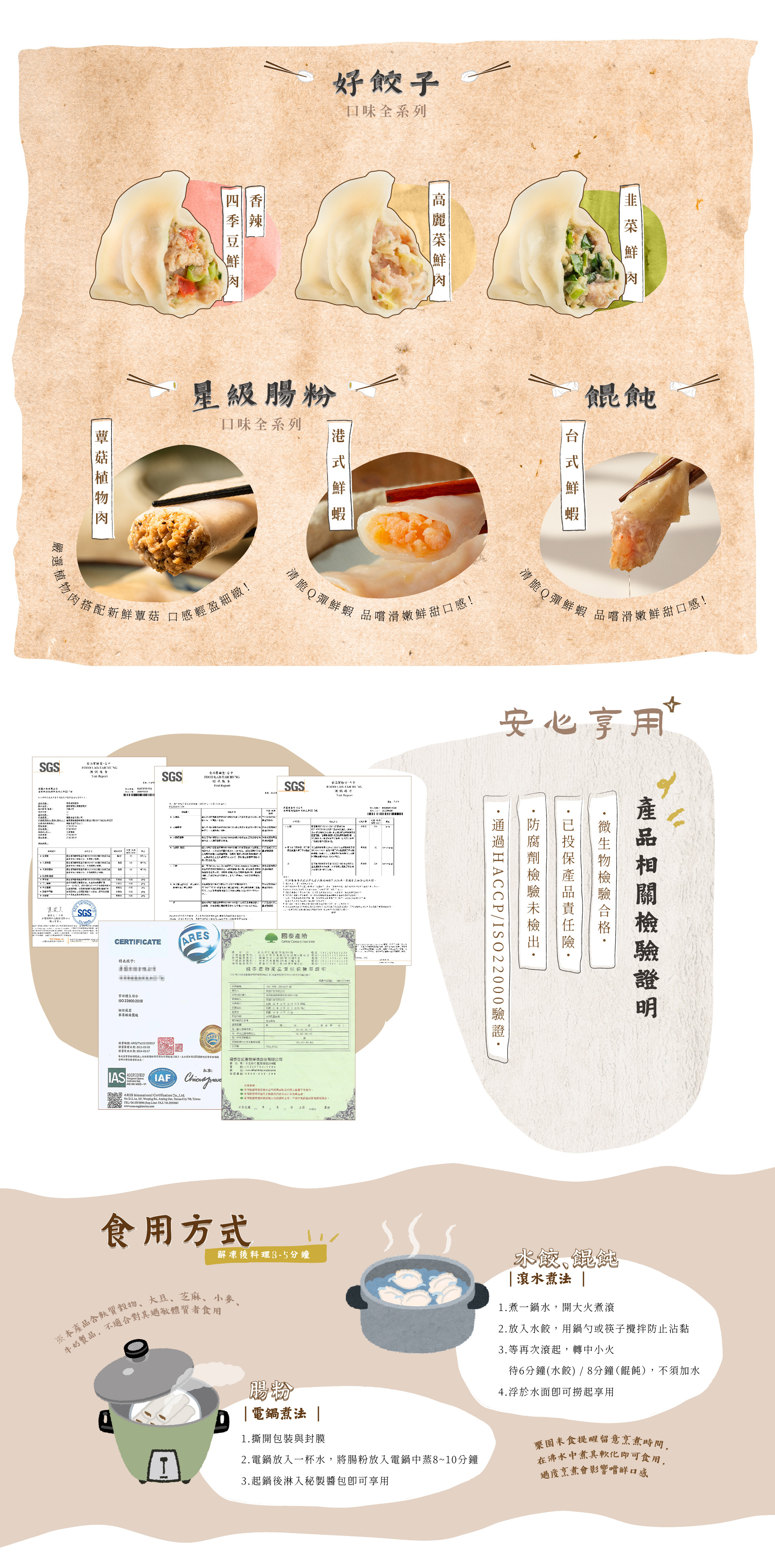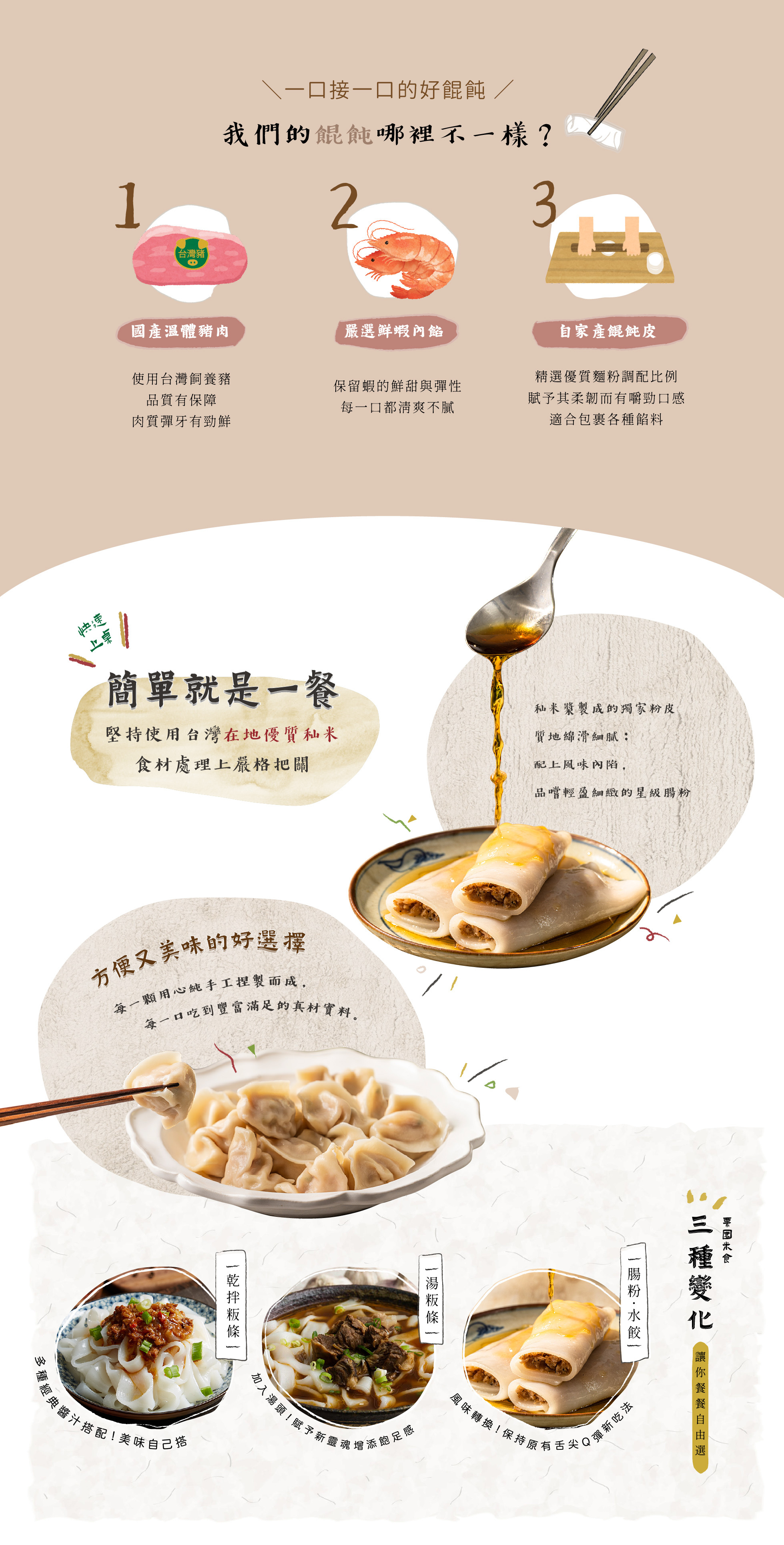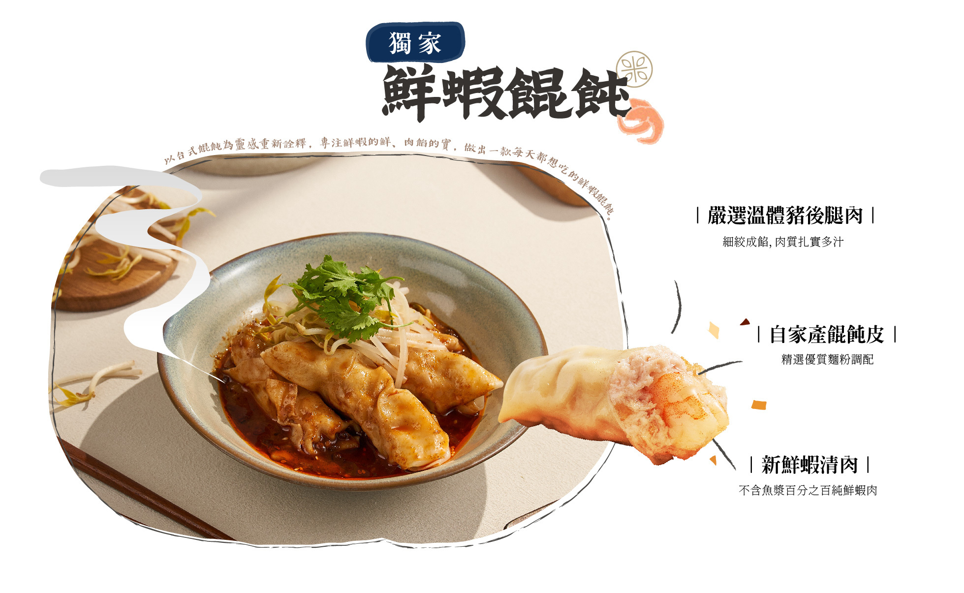 嚴選溫體豬後腿肉細絞成餡,扎實多汁,完整包裹鮮甜大蝦;餛飩皮Q彈滑嫩,口感層次分明。用料單純、營養滿分,呈現最道地的台式鮮蝦餛飩美味。